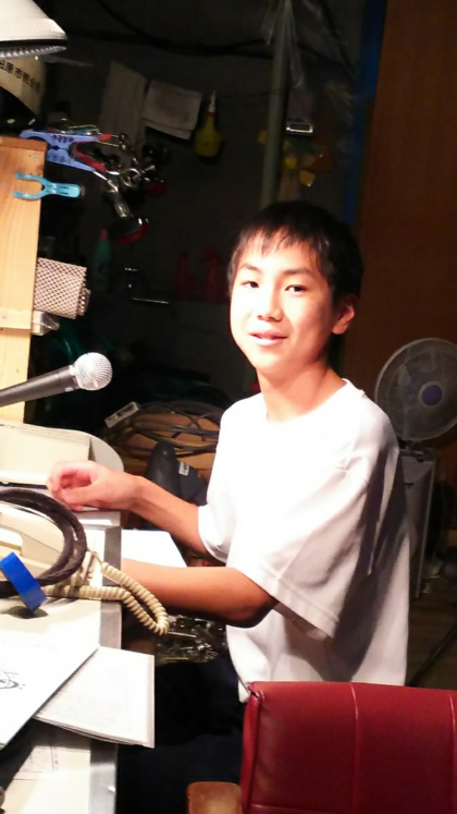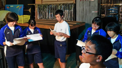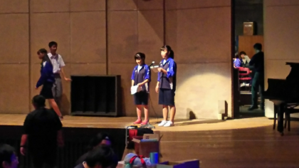 舞台袖でアナウンスを、ステージでは司会者が挨拶の練習をしています。