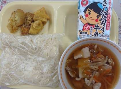 今日の給食のメニューは、ワンタン麺、おさつシナモン、牛乳です。