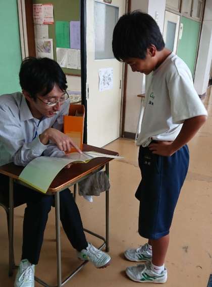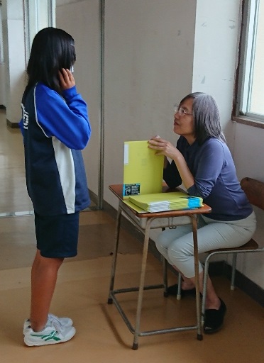 写真(上)は4組の高木清司先生、(下)は1年5組の小泉満利子先生です。どのクラスも一人一人通知表を手渡しながら担任の先生から具体的なアドバイスを言っていました。