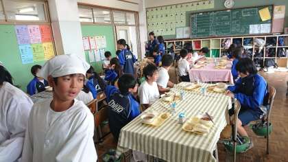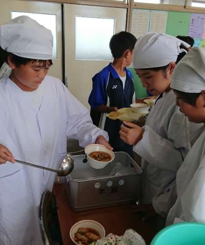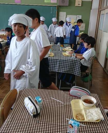 写真は、1年5組の準備風景です。担任の小泉満利子先生が来ない間も、自分たちでしっかりと準備ができる5組です。