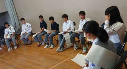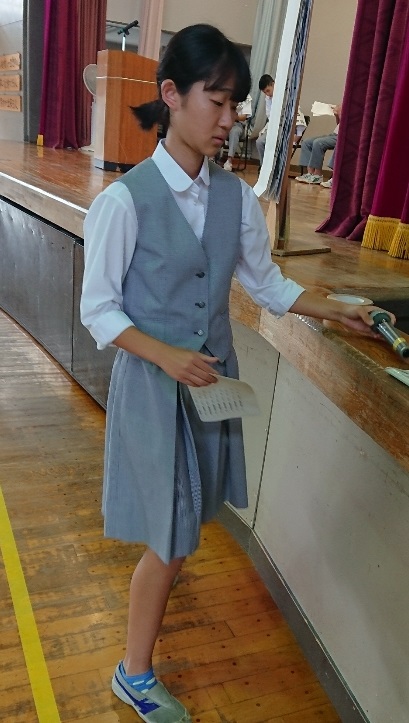 今日の5校時目は、体育館での立会演説会です。写真(中)は緊張している候補者たち。(下)は「開会の言葉」の3年生の選挙管理委員です。