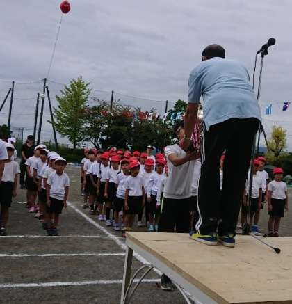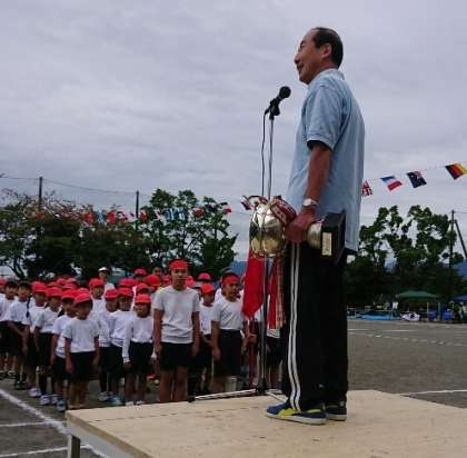 昨年度優勝の赤組代表者が、手塚高弘校長先生に「優勝杯返還」のあと、そのまま続けて「校長先生の話」となりました。優勝杯を持ちながら話をされました。千代小の岡部和明校長と同様、わかりやすいお話でした。