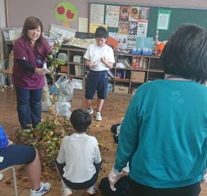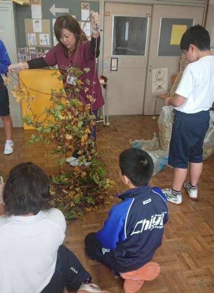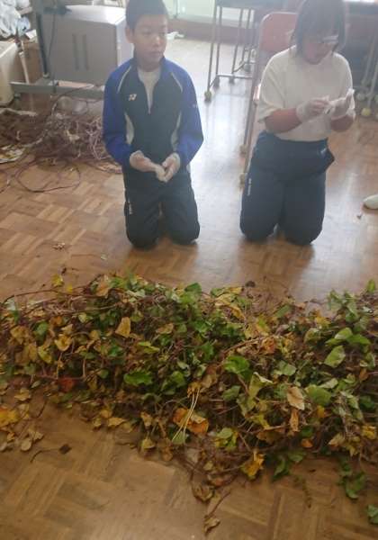 先日サツマイモと一緒に収穫したサツマイモのツルを使って、今日は“リース作り”です。手袋をして、葉っぱを取る作業です。みんな集中しておこなっていました。岩本絵理子先生の説明もわかりやすく、みんなもすぐに理解できました。