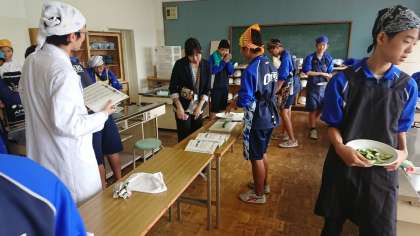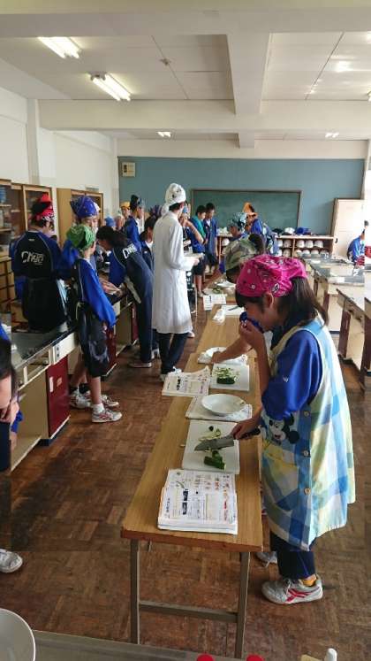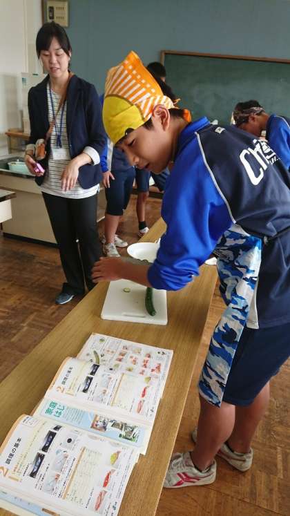 写真は、調理室です。今日は、“キュウリ切りのテスト”です。高木清司先生の指示をよく聞いています。包丁の切れ味もよく、とんとんとキュウリを切っていました。担任の西山佳実先生もきてテストの様子を見ていました。