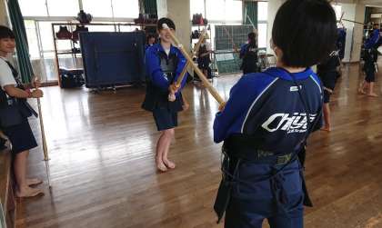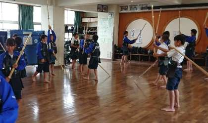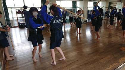 写真は、多目的ホールです。1年3組の剣道の授業です。“胴打ち”を楽しそうにやっているところです。