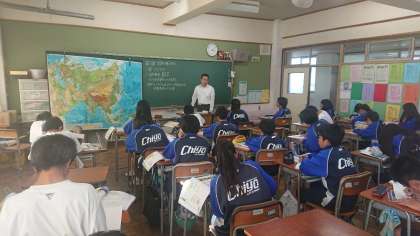写真は、美本大輔先生の地理の授業です。アジアの地図を使って、山や川の名前など質問すると1年生はすぐに答えていました。