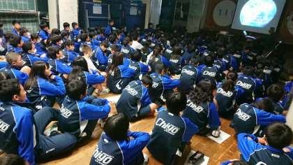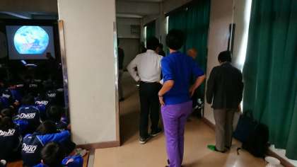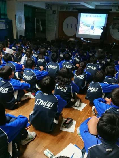 写真は、2校時目の多目的ホールの様子です。今日はシニアボランティア派遣事業で講師8人の方々にお越しいただき「命の水、環境の水、干上がったオアシス、死海」という長いタイトルの授業です。