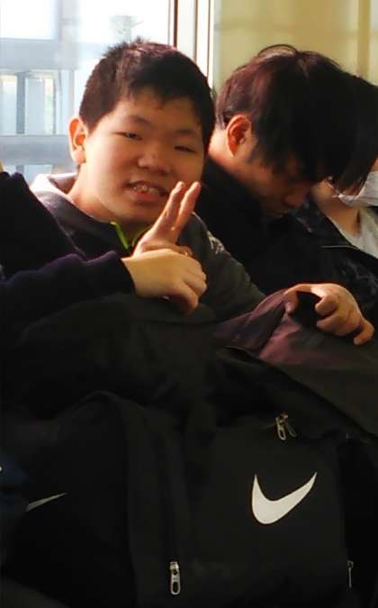 写真(中)は、電車の中でウトウトしている中山望先生です。隣で眠っている中山先生を見て、嬉しそうにピースサインです。