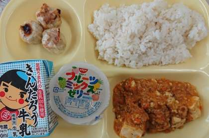 今日の給食のメニューは、麻婆豆腐、焼き焼売、麦入りご飯、牛乳、デザートです。