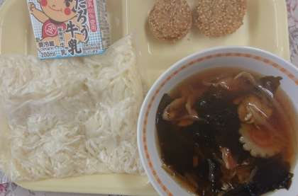 今日の給食のメニューは、わかめラーメン、南瓜胡麻フライ、牛乳です。