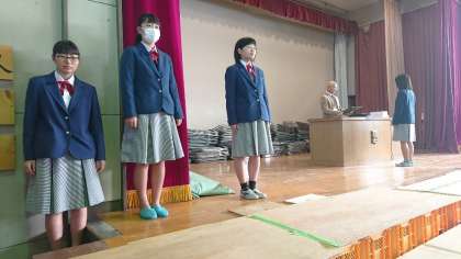 今日の3年生は、入場から退場まで通しての練習です。写真は学年主任の佐々木彰先生が校長役となっての「証書授与」の場面です。呼名されて「はいッ」の返事が小さいと保護者はがっかりするので、名前を呼ばれたら大きな声で返事して!。