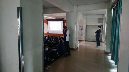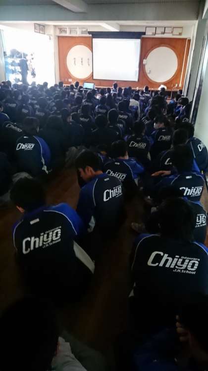 多目的ホールです。来年度の6月17日(月)から2泊3日の修学旅行に向けて、事前学習用のDVDを視聴しているところです。