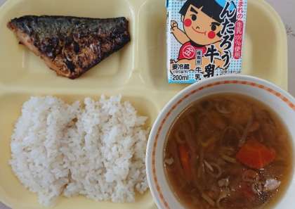 今日の給食のメニューは、鰆の香味焼き、とろみ汁、麦入りご飯、牛乳です。
