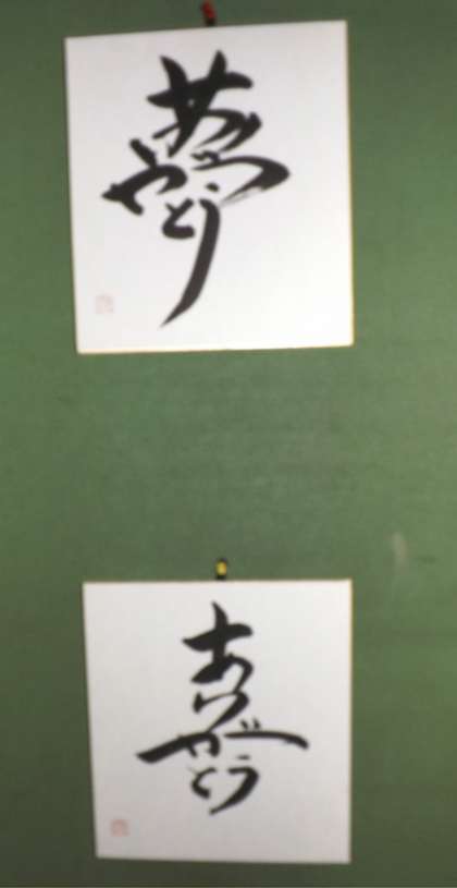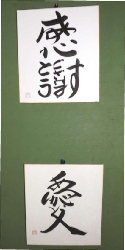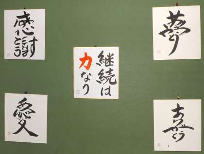 今日の「お別れ集会」で鈴木元子先生が3年生に向けて書いた色紙が3年生のフロアの壁に飾られています。「継続は力なり」「夢」「喜」「愛」「感謝」、よーく見ると、周りの4枚の漢字は「ありがとう」のひらがなで書かれています。