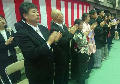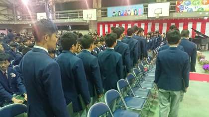写真(上)は卒業生退場で先生方も起立して拍手で送っているところです。
