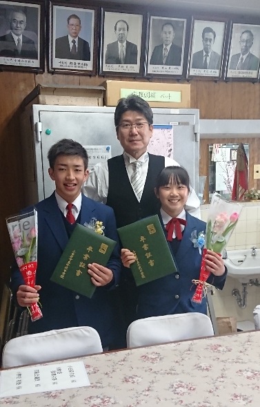 3年生にとって中学校最後の「帰りの会」が終わったあと、「校長先生、写真撮ってください!」と校長室にやってきてくれた2人です。校長と写真を撮りたいと言ってくれる生徒はなかなかいないので、喜んで撮ったのが写真(下)です。