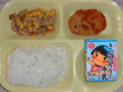 今日の給食のメニューは、ご飯、ハンバーグガーリックソースがけ、ウインナーときのこのソテー、牛乳です。