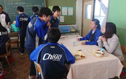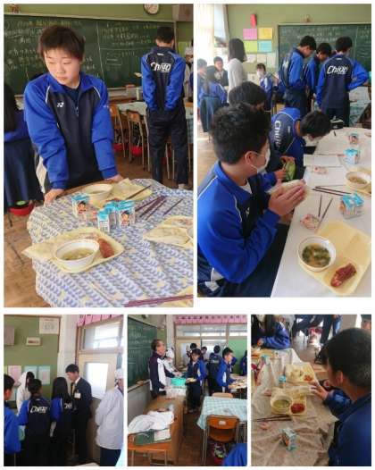 写真(下)、3年担任だった山田ななえ先生が、職員室から給食を持って1組教室に来てくれました。1班に入って楽しそうに談笑しているのがよくわかります。