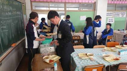 写真(中)、1組教室で学年主任の加藤太一先生が、麺を半分にしてお椀に入れていました。