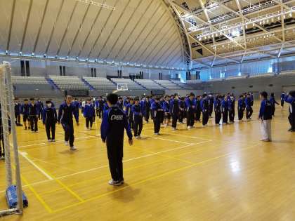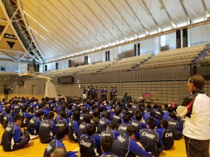開会式、準備体操の「千代ジム」をやり、これからバスケットボール、フットサル、ドッジボール、ハンドボールの4つで競技が始まります。