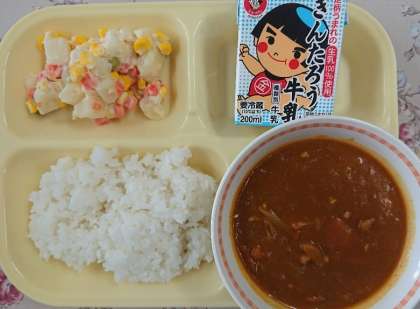 平成30年度最後となる今日の給食のメニューは、ポークカレー、ホットポテトサラダ、牛乳です。