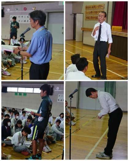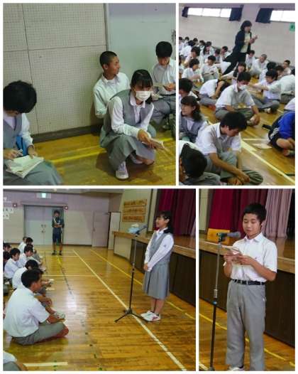 写真は、体育館の様子です。17日(月)からの修学旅行の「事前指導」です。実行委員が進行しました。