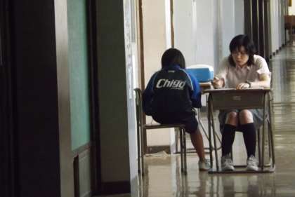 写真下は、廊下でクラスの生徒と個人面接をしている4組担任の西山先生です。今週〜来週の2週間は教育相談週間で、休み時間や放課後、総合で作業をしている合間などで個別に面接をしています。