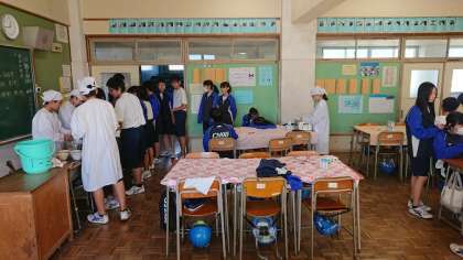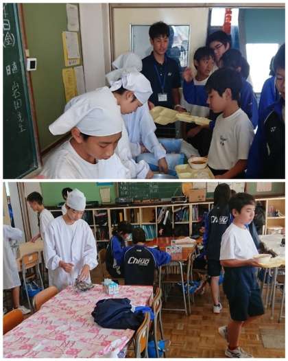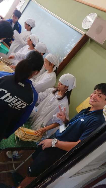 1年3組です。担任の岩田大地先生もピースサインで配膳の手伝いです。