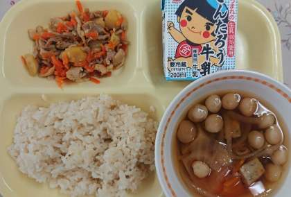今日の給食のメニューは、栗ご飯、すまし汁、牛乳です。