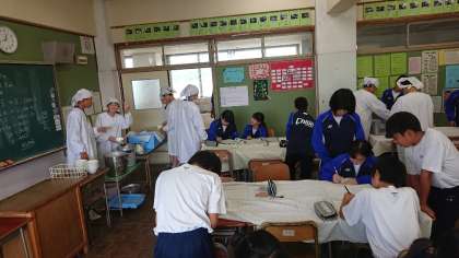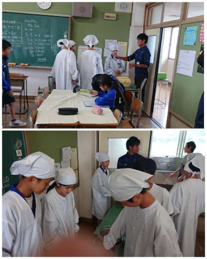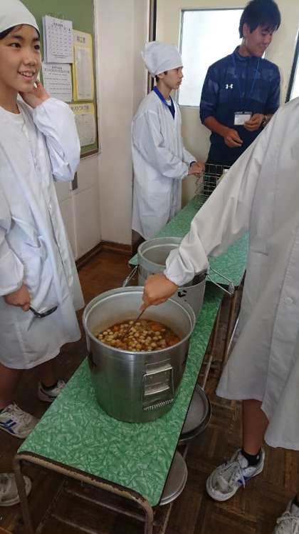 1年4組です。山室航太先生も配膳の手伝いです。写真(下)は大食缶ですが、白玉麩がたくさん浮いているのを見た当番が「タピオカ?」と言っていました。今度タピオカの入った給食もいいかもしれませんね。