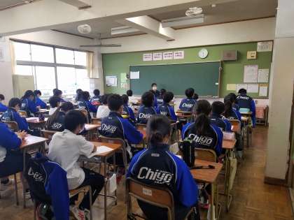 雨のために教室で行いました。静かに落ち着いて聞くことができました。校長先生の話や各学年の代表生徒の人の話を聞いて、もう一度、立ち止まり自分を振り返り、来週から迎える後期から新たな気持ちで頑張っていきましょう。