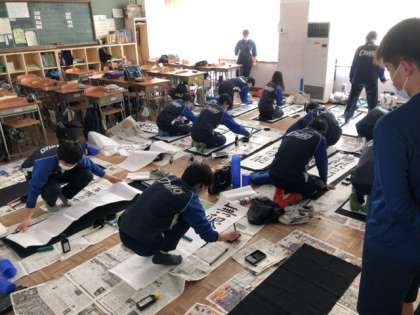 3年生の国語科では、現在、“書”を作成しています。お題は「無限の可能性」です。密を避けるために、クラスが二つに分かれて別室で取り組んでいます。