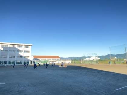 10月29日(金)のグラウンドでの朝練習の様子です。宇宙まで抜けるような青空です。写真には、野球部、男子バスケットボール部、ソフトテニス部が写っています。体育館からも一生懸命に練習している様子が、音で伝わってきました。