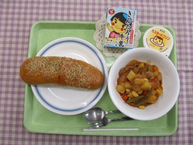 <給食委員会の子どもたちからのお知らせ>ポークビーンズに入っている大豆についてです。大豆は、“畑の肉”と言われるほど肉や卵に負けないとてもよいたんぱくしつを多く含みます。また、大豆レシチンという栄養素が脳の働きを活発にし、きおく力やしゅうちゅう力を高めてくれます。ポークビーンズをしっかり食べて午後の授業にそなえましょう。