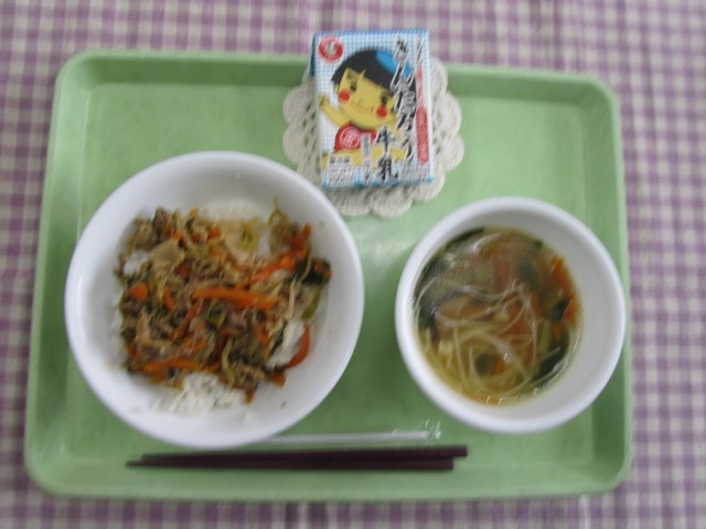 <給食委員会の子どもたちからのお知らせ>ビビンバはおとなりの国、韓国の料理です。ごはんの上にもやし、ほうれん草、にんじんなどのナムルをのせ、焼いた肉や卵をのせて食べるときによくまぜます。ビビンバは「まぜごはん」という意味だそうです。