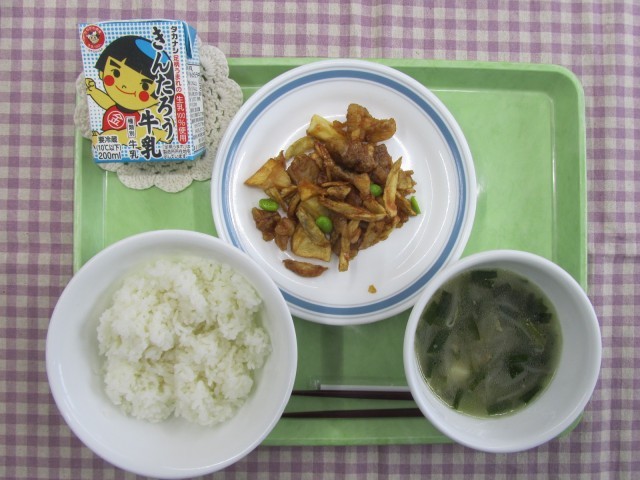 <給食委員会の子どもたちからのお知らせ>チキンチキンごぼうは、山口県の学校給食で始まったものです。各家庭でオリジナル料理を募集し、そこによせられたレシピをもとに作られたそうです。一口サイズのとりのから揚げと素揚げしたごぼうを甘辛いたれでからめたものです。千代小学校のチキンチキンごぼうには、じゃがいもも入れました。みなさんいかがですか。