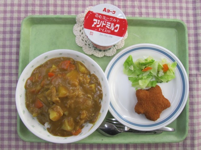 <給食委員会の子どもたちからのお知らせ>今日は少し早いクリスマス献立です。千代小学校で人気のあるチキンカレーライスと星形のコロッケです。みなさん、いかがですか?冬休みまであと少しなので、残さず、しっかり食べてかぜをひかないようにしましょう。今日は今年の給食は最後になります。冬休みは、クリスマスや大みそか、お正月などの行事があり、食生活もみだれがちです。食事は3食しっかり食べ元気に過ごしましょう。