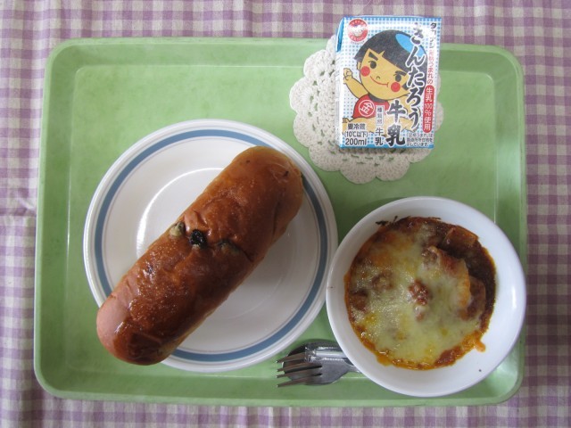 <給食委員会の子どもたちからのお知らせ>今日は、3・4年生からのリクエスト給食で1位だった“ラザニア”です。62票入りました。2位はフライドチキンで46票。3位はABCスープで35票でした。リクエスト給食で1位ではなかった給食もほかの月で取り入れてくれますので、楽しみにしていてください。