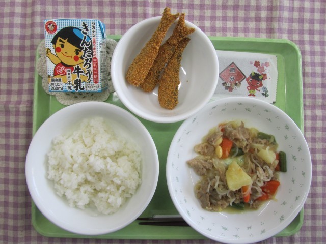 <給食委員会の子どもたちからのお知らせ>今日は節分です。節分には、「みんなが無事で幸せに過ごせますように」という意味をこめて、豆まきをしたり、いわしを焼くにおいで鬼を追い払います。そして、今日の給食は、大豆入り塩肉じゃがと栄養たっぷりのいわしのカリカリフライと節分のりです。しっかり食べて健康を願いましょう。明日は、給食委員会による朝の朝会をしますので、楽しみにしていてください。