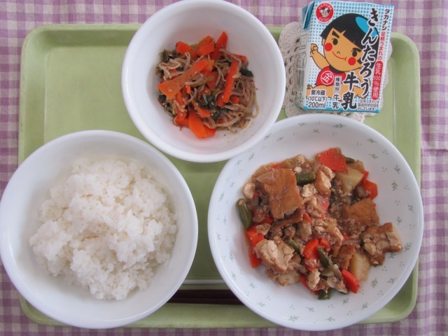 <給食委員会の子どもたちからのお知らせ>生揚げはとうふからできています。生揚げはとうふのよいところと油揚げのよいところの両方があります。とうふのよいところはお肉にかわるよいたんぱくしつがたくさん入っていること、油揚げのよいところは、味がしみこみやすく形がくずれないことです。今日は、生揚げを味わって食べてみましょう。