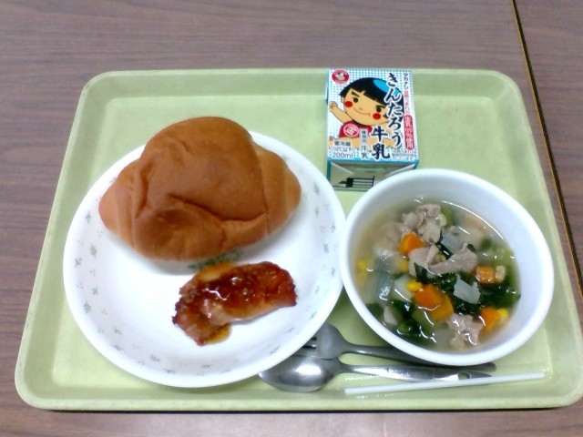 <こんだて>ぎゅうにゅう ロールパン てりやきチキン ABCスープ