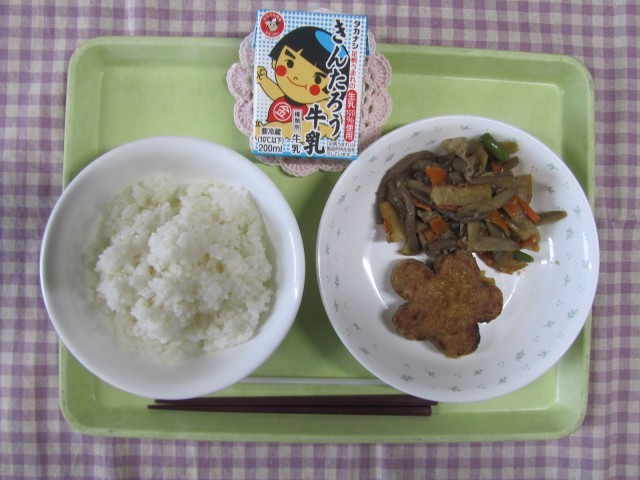 ・ぎゅうにゅう ・ごはん ・はながたハンバーグ和風ソース ・こんにゃくのきんぴら