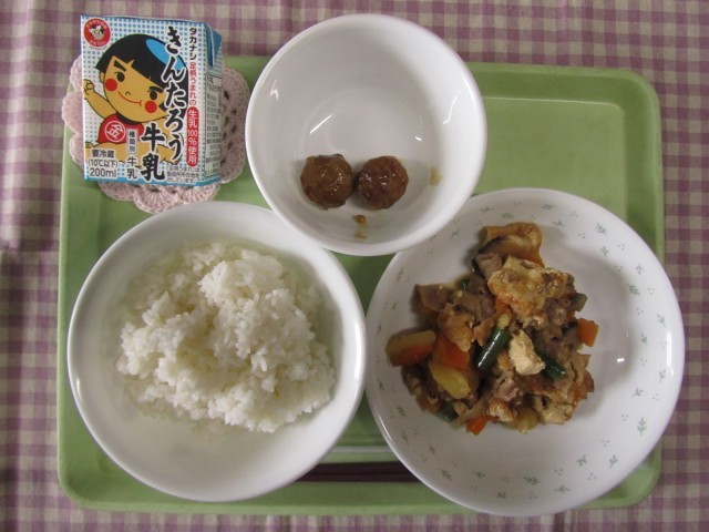 <給食委員会の子どもたちからのお知らせ>ぶた肉とやさいといっしょに生揚げを煮ました。ぶた肉と生揚げのうまみがからみあって、やさいもたっぷり食べられるこんだてです。味わってたべてください。