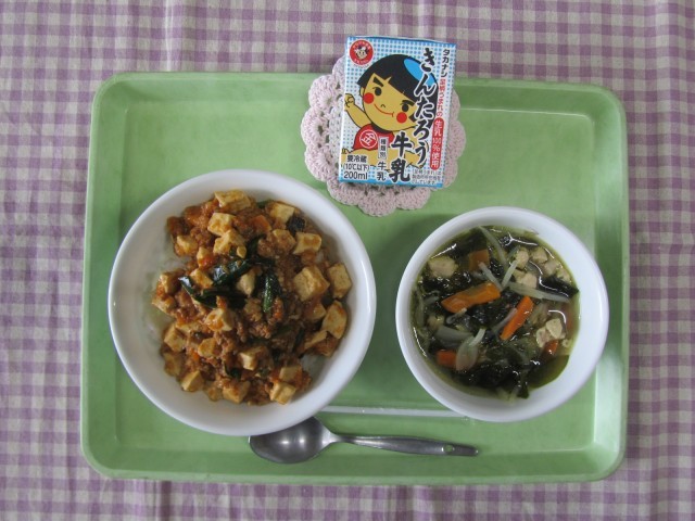 <給食委員会の子どもたちからのお知らせ>今日は、マーボー豆腐です。みなさん、好きですか。豆腐は、大豆からできています。大豆は「畑の肉」とよばれるほど栄養がたくさんあります。大豆は、とうふのほかに、みそやしょうゆなど、さまざまな形に変化して食卓によく出てきます。そして、今日の「わかめ」は、神奈川県の三浦半島の近くでとれたものです。給食では地元でとれたものを積極的に使っています。みなさんも地元でとれた食べ物をさがしてみてくださいね。