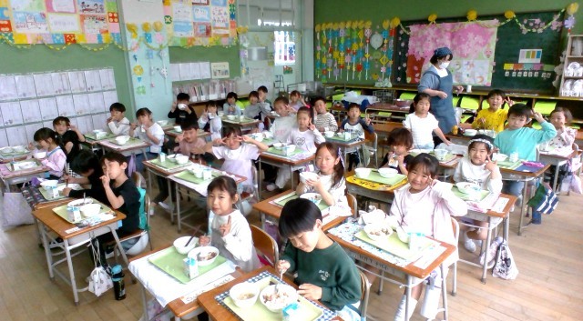 本日、視力・聴力検査の際に子どもたちに、「給食の様子を見に行くよ。」と約束しましていたので、教室を訪れました。子どもたちは「先生、来た!」と言って、笑顔一杯でした。様子を見ると、美味しそうに給食を食べていました。見ているこちらまで幸せな気持ちになりました。