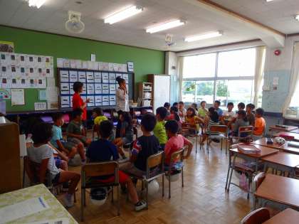 廊下を歩いていると3年生の方から楽しげな声が聞こえてきます。見てみると3組でALTのテリタ先生が授業をしていました。