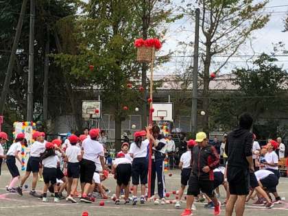 なかよし班種目の玉入れです。なかよし班とは1年生から6年生までの縦割り班です。普段の掃除なども一緒に行っています。