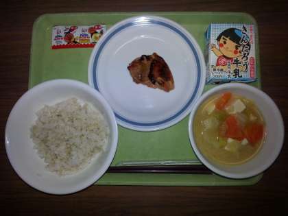 麦ごはん 鶏肉のレモン醤油焼き 白菜の味噌汁 あんぱんまんふりかけ 牛乳