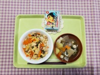 給食委員会の子どもたちからのお知らせです。春野菜のスープには、今とてもおいしいきゃべつやアスパラガスが入っています。その時期においしく食べられるものを“旬”と言います。旬の食べ物は、新鮮でおいしく、栄養が豊富に含まれています。給食でも、旬の食べ物を取り入れていくので楽しみにしていてください。また、ヨーグルトの中にはおなかの調子を整えたり、ウイルスや細菌を体を守るはたらきがあったり、体をを強くする効果がある乳酸菌が入っています。