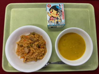 牛乳 チキンライス パンプキンポタージュ 今日はハロウィン献立で、かぼちゃを...
